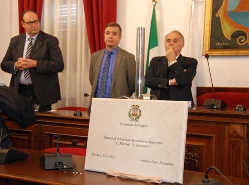Il tanto atteso intervento del sindaco è arrivato subito dopo: “Ringrazio pure io il presidente on. Antonio Pepe. Venerdì abbiamo dovuto rimandare, perché si votava la fiducia al Governo Monti. Il presidente ha voluto essere presente, quindi abbiamo spostato tutto a oggi perché volevamo la sua presenza. Voglio ringraziare tutti gli assenti, giustificati. Sua Eccellenza il Prefetto ci ha chiamato, perché aveva altri impegni, facendo gli auguri a tutta la comunità. Volevo anche ringraziare il professor Solitro, preside del Liceo e dell'ITT, anch'egli purtroppo impegnato, come pure Giuseppe D'Avolio. Oggi è un giorno di festa. Da vent’anni si aspettava l'edificio di questo istituto, perciò oggi inizia un nuovo cammi¬no per la Scuola Superiore.