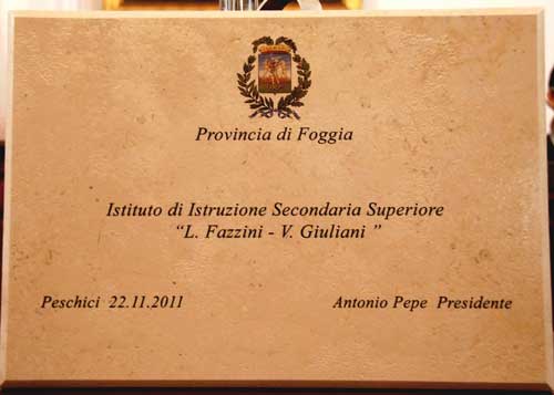 Clicca per Ingrandire 22 novembre 2011, ore 11.05: nell'Aula Consiliare del Comune di Peschici si raccolgono gli alunni del Liceo e dell'ITT di Peschici, gli amministratori provinciali e comunali, le forze dell'ordine e i parroci. Finalmente, dopo tanti anni di attesa, si inizia a profilare una nave all'orizzonte, la nave della salvezza che metterà fine alle sofferenze di tanti studenti che, come naufraghi sperduti nell'oceano, hanno sempre sperato che questa situazione potesse arrivare a una svolta. Oggi la posa simbolica della prima pietra del nuovo edificio delle Scuole Superiori.
