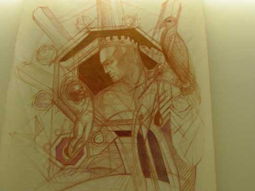 Lidia Croce (pittrice e scultrice originalissima per la modernità dell’opera) ha illustrato la sua creazione ispirata al prismatico ottagono di luce che, da contenitore, si metamorfizza in capsula temporale nella quale il Re si è incastonato, traendolo da se stesso. Una teoria grafica composta di linee semicurve, tracciate col “compasso a corda” usato dagli antichi progettisti. Il cuore è costituito da una bifora, e il corpo si erge come un portale su gruppi di giovanissimi Telamoni, saldando il Sé in una simbiosi con l’Architettura, senza soluzione di continuità. Orologio solare e quadrati magici sono le fonti d’ispirazione nobili, con ascendenze vitruviane.