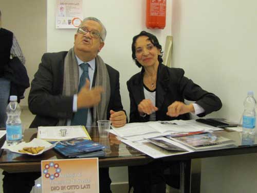 A colloquiare col numeroso pubblico presente sono stati il critico Gaetano Mongelli (formatosi alla scuola di Cesare Brandi, incaricato recentemente di una “expertise” su un presumibile “Van Gogh”), nonché docente di “Storia dell’arte moderna” all’Università di Bari, e l’artista figurativa Lidia Croce (foto 3, i relatori), intervenuta al vernissage del dipinto da lei dedicato a “Federico II architetto” (foto del titolo).