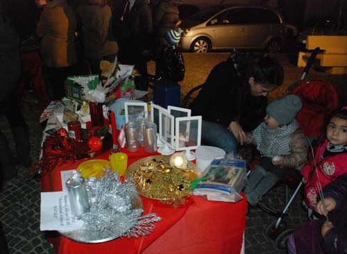 Il tutto mentre proseguiva la sua attività, iniziata il mattino alle 10.30, il primo Mercatino di Natale (foto 7), che ha continuato anche nel pomeriggio a raccogliere il contributo volontario degli acquirenti in cambio di eccentrici oggetti e curiose suppellettili. Intanto che la cerimonia si avviava al termine con la citazione degli ulteriori eventi in programma dal 4 dicembre al 6 gennaio, la gerla di Babbo Natale sostituiva le leccornie con le Stelline (foto 8-10) portate dai bambini, Stelline che parteciperanno alla serata finale del Festival con la grande distribuzione di “pensierini” a ciascuno di loro.