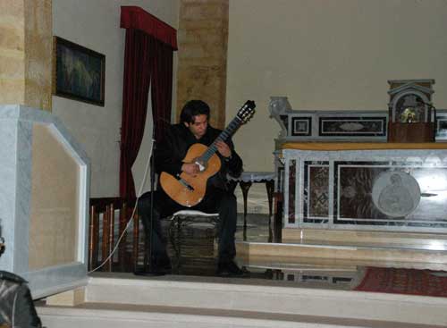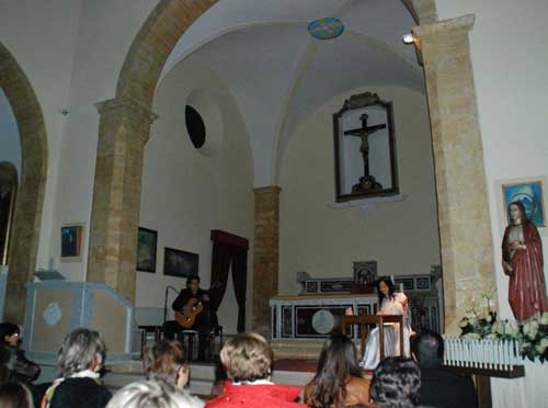Ci chiederemo sempre come sia riuscita Camilla Tavaglione a entrare con tanta veemenza e condivisione in questo scenario mistico e impraticabile comunicando il senso profondo dei versi che compongono l’opera meriniana e trasmettendo al pubblico non solo le proprie emozioni ma perfino suscitandone altre, ancora più profonde. Da qui la certezza che quanto infuso negli spettatori peschiciani si ripeterà nei viestani il 18 prossimo, in Cattedrale, e poi il 29 nell’Auditorium di Vico del Gargano e il 4 gennaio nella Matrice di Cagnano Varano, impreziosendo il suo recital con le divagazioni musicali dell’onnipresente Rocco Tavaglione (foto 8-9-10), autentico talento e virtuoso della chitarra classica. Un minitour che spezzerebbe le gambe alla più navigata delle attrici ma che la Tavaglione ha deciso di intraprendere cosciente della forza interiore che la trascina e coinvolge in questa esperienza, sorta di “mission impossible” capace di rigenerarla e ricaricarla come una pila mai esausta.