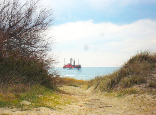 La multinazionale - già attiva nei nostri mari da martedì 24 gennaio col posizionamento di grosse piattaforme visibilissime dalle nostre coste (foto del titolo e 1-2 sotto; ndr) - ha avviato i primi sondaggi geoispettivi che, da quanto riferito da pescatori e cittadini del posto, hanno portato a una preoccupante interdizione assoluta alla balneazione e all'attività di pesca di una vasta area marina!