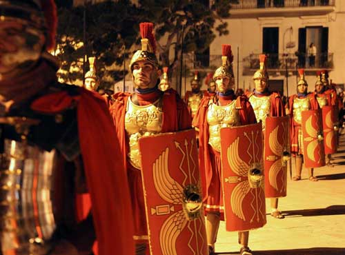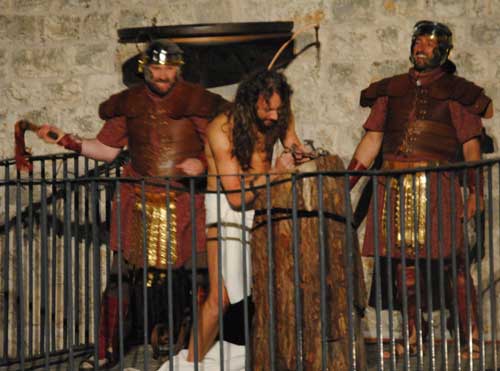 SCENOGRAFIA = Il nuovissimo cenacolo è stato ricostruito e arricchito con nuovi elementi scenografici fedeli all’epoca sulla suggestiva scalinata di “Rampa Villa”. Il Getsemani curato nei minimi particolari all’interno della secolare “Villa Garibaldi”. Altri nuovi allestimenti scenografici composti da enormi trìpodi saranno apposti in Piazza XX Settembre (Piazza Municipio) dove sarà allestito l’accampamento dei centurioni romani (foto 2) che li vedrà in uno scontro armato coi soldati del Tempio. Il Tempio del Sinedrio e il processo di Gesù, opera dei Sommi Sacerdoti, quest’anno subirà una trasformazione scenografica: oltre alla nuova e più suggestiva location situata sulla balconata adiacente la Torre Dodecagonale, si potrà ammirare l’ampio spazio di Corso Domenico Morea dove sarà allestito il nuovo pretorio con l’accampamento romano (da qui partirà Ponzio Pilato). Le prigioni dei Ladroni e Barabba saranno ubicate sulla Muraglia di San Benedetto. Il Processo di Pilato a Gesù vedrà nuovamente il maestoso scenario della balconata della Pinacoteca del Castello, arricchita con la colonna dove Gesù verrà flagellato alla vista di tutti (foto 3). La grandiosa scenografia su Largo Castello, che vede come sfondo alla Crocifissione la Gerusalemme antica, riprodotta e riproposta dalle immagini dei Sassi di Matera, sarà arricchita di materiali scenografici per un totale di 600 mq.