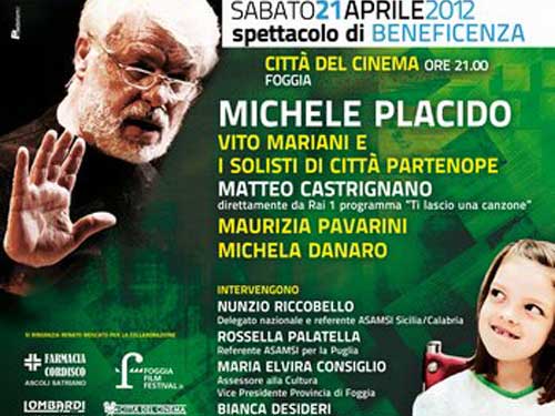 Clicca per Ingrandire Asamsi onlus, Associazione per lo studio delle atrofie muscolari spinali infantili, Michele Placido e Associazione La Bottega dell'Attore-Teatro Studio Dauno, diretta da Pino Bruno, in collaborazione con Assessorato Cultura Provincia di Foggia e Città del Cinema, presentano “Insieme ce la possiamo fare”, spettacolo di beneficenza con Michele Placido, Vito Mariani e I Solisti di Città Partenope, Matteo Castrignano direttamente da Rai1 (“Ti lascio una canzone”), Michela Danaro, cantante, e la partecipazione di Maurizia Pavarini.