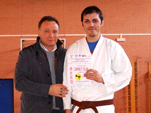 Nella classifica finale tre ottimi atleti. Nell’ordine: 3° classificato il neo M° c.n. Carmine Sergio Giuliani di Bari, 2° Giovanni Romondia di Vico, 1° Leonardo Dattoli di S.Severo. Degno di nota l’eccellente triplo primato di Dattoli, 1° assoluto anche per kata e campione nazionale a squadre 2012 per la “Dankan kempo kai” di S. Severo. A giugno si rinnova l’appuntamento per gli internazionali WKDF dove i nostri campioni sono chiamati a rappresentare i colori nazionali. A Gianni Romondia e al suo maestro Matteo Russi (foto del titolo; ndr) un ‘ in bocca al lupo’.