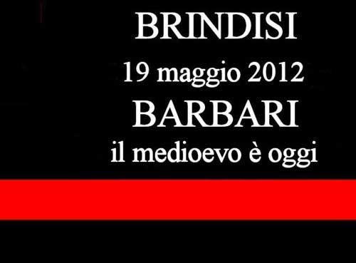 CARLA DE NUNZIO - presidente Associazione Ideale Osservatorio Torre di Belloluogo (Le) = A nome dell'Associazione che rappresento esprimo dolore, indignazione, condanna e sdegno per il feroce attentato criminale e mafioso compiuto davanti l'Istituto per i Servizi Sociali "Francesca Morvillo Falcone" di Brindisi che ha causato la morte della studentessa Melissa Bassi e il gravissimo ferimento di altre allieve, tra cui Veronica Capodieci che lotta contro la morte. La crudeltà, la malvagità e la spietatezza degli infami e vili assassini che hanno colpito queste giovani vite innocenti sono esecrabili e meritano solamente la più decisa e ferma risposta di tutta la società civile e dello Stato, senza perdono e senza pietà.