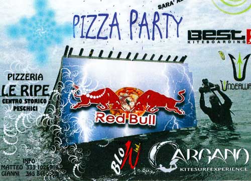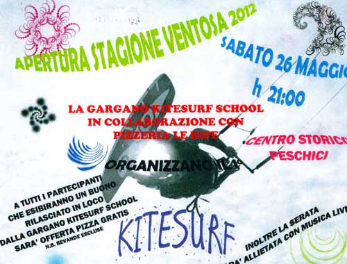 Clicca per Ingrandire La “Gargano Kite Surf School” di Peschici, in collaborazione con la locale Pizzeria “Le Ripe” ubicata in pieno Centro Storico organizzano per la giornata di domani, 26 maggio alle 21, il primo “Kite Surf-Pizza Party”. La serata verrà allietata da musica live e si preannuncia ricca di ‘movida’ allegra e spensierata. A tutti i partecipanti sarà offerta una degustazione gratis (escluso le bevande) appena sfornata dal pizzaiolo doc “Sergio” solo se esibiranno il buono rilasciato dalla scuola di kite surf. Per fornirsene basta telefonare ai numeri di cellulare 333.10.26.908 (Matteo) e 345.84.60.560 (Gianni).