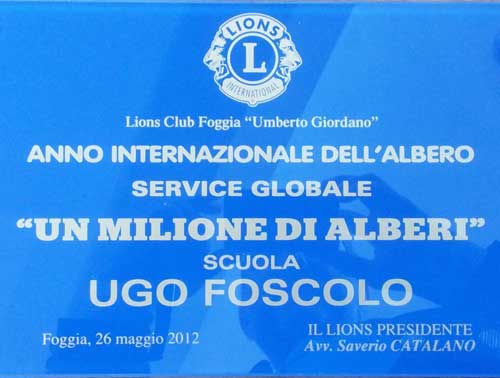 Clicca per Ingrandire Nell’ambito del service “messa a dimora di 1 milione di alberi” - in cui il presidente internazionale Wing-Kun Tam ha invitato i Lions di tutto il mondo a piantare un milione di alberi nel corso di quest’anno sociale per dimostrare la forza della loro rete globale - il Club di Foggia Umberto Giordano ha provveduto alla messa a dimora di piante e piccoli alberi presso due scuole di Foggia, la Elementare “Vittorino Da Feltre”, sabato 19 maggio, e la ”Ugo Foscolo” sabato 26 maggio, in una manifestazione a cui hanno partecipato soci del Club, dirigenti scolastici, alcuni docenti e molti alunni, parte attiva dell’evento. Per ricordare il Service è stata apposta in ogni scuola una targa a memoria dal presidente del Club Saverio Catalano (foto 1 sotto; ndr).