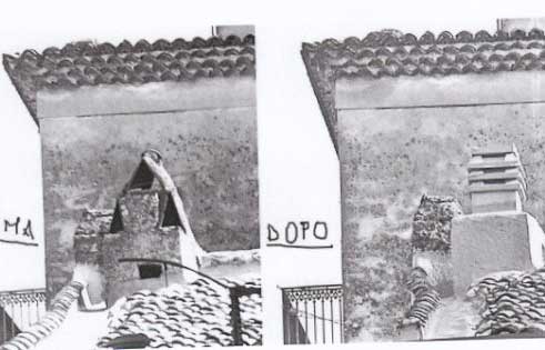 La terza immagine mostra la decapitazione dell’ennesimo comignolo (foto sotto n. 2), con relativa metamorfosi in qualcosa di ultra moderno... obbrobrioso, estraneo. Il tutto nella totale indifferenza e, quello che è ancora peggio, con l’ausilio e la complicità dei nostri tecnici in erba ai quali, in tutta modestia, consiglierei un maggior approfondimento delle tematiche architettonico-ambientali.