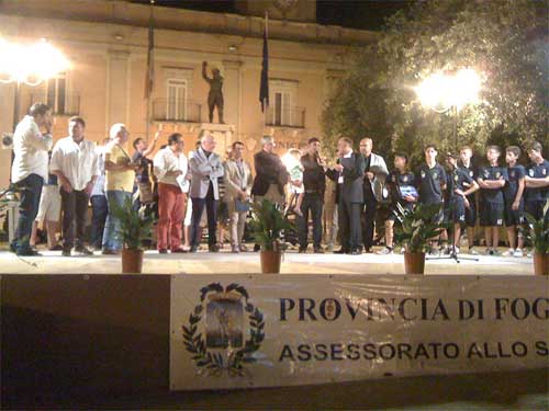 Clicca per Ingrandire Al cospetto di autorità di primissimo piano del mondo dello sport (il vicepresidente nazionale del Coni Michele Barbone, il presidente della Figc Puglia Vito Tisci, l’assessore allo Sport provinciale Rocco Ruo, il vicepresidente del Coni foggiano Nico Palatella, il responsabile dell’Unione Nazionale Veterani dello Sport Luigi De Santis), si sono alternati sul palco atleti, dirigenti e tecnici giunti da ogni parte del promontorio garganico per ritirare la meritata targa di riconoscimento e il gagliardetto dell’Amministrazione provinciale.