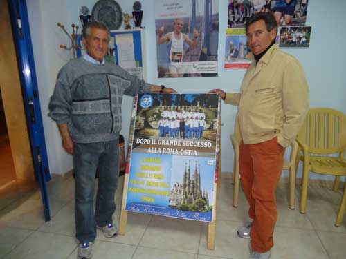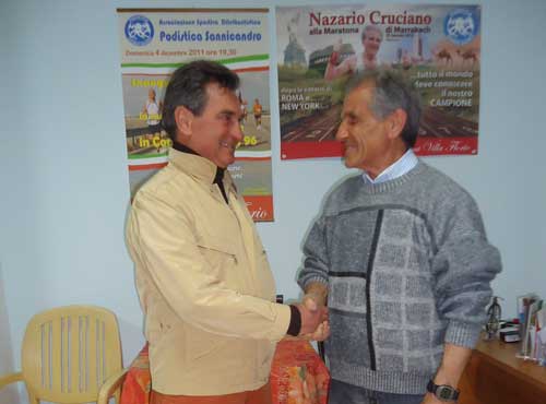 «Nel mese di aprile ho conosciuto di persona il maratoneta sannicandrese Nazario Cruciano, atleta sorridente, giovanile (ha solo più di… 65 anni! - foto del titolo, manifesto Maratona di New York; ndr) e affabile tanto da consentire subito il dialogo amichevole, mettermi a mio agio e confidargli le mie esperienze agonistiche. Ci siamo confrontati nelle diverse discipline delle gare fatte in Italia e all’estero, su tempi, metodo di allenamento, ‘ripetute’, emozioni delle premiazioni, difficoltà delle trasferte, successi ottenuti e tanti chilometri percorsi. Entrambi abbiamo raggiunto traguardi inaspettati nonostante l’inserimento alle competizioni sia avvenuto in età avanzata. Gli ho spiegato come anch’io, per caso, abbia intrapreso l’agonismo e gli ho raccontato… (foto 1-4 sotto, in maglione grigio Cruciano, con Antonio Monte)»