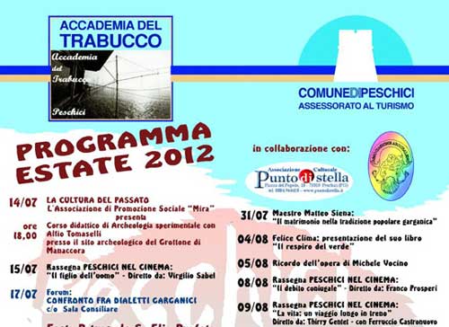 Clicca per Ingrandire Varato il Programma Estate 2012 di Peschici. L’Accademia del Trabucco, col patrocinio dell’Assessorato al Turismo del Comune e la collaborazione di altre Associazioni locali - “Punto di Stella”, “Arcobaleno”, “Mira”, - presenta una scaletta oltremodo variegata e ricca. Si comincia il 14 luglio con “La cultura del passato”, corso didattico di Archeologia sperimentale di Alfio Tomaselli nel sito archeologico del Grottone di Manaccora, ore 18 (leggi su http://www.puntodistella.it/news.asp?id=5726) programmato dal sodalizio di promozione sociale “Mira”. E si termina il 20 settembre col ricordo dell’indimenticato e indimenticabile cantautore folk apricenese Matteo Salvatore.