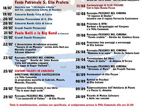 Musica e teatro non sono stati dimenticati: “Giovani talenti in concerto” (dir. Michele Castelluccia) col repertorio di Gabrieli, Mozart, Mancini, Piazzolla il 25 luglio e la rappresentazione della “Aulularia” di Plauto il 9 settembre. E ancora musica ma stavolta all’interno della Festa Patronale di Sant’Elia Profeta, appuntamento annuale inderogabile della religiosità popolare. Si aprirà infatti il 18 luglio con la “Orchestra Libetta” composta da 56 elementi frequentanti la scuola media inferiore dell’Istituto Comprensivo Libetta (dir. Mario Manicone), un onore che spetta a pochi ma gli alunni se lo sono ampiamente meritato. Il 19 e il 20 concerto della Banda “Città di Lecce” al termine della solenne processione del Patrono (al proposito leggi il commento del presidente della Banda di Peschici che corregge la locandina precisando essere la sua banda, il 20, a chiudere la serata; ndr), mentre il 21 la serata sarà allietata da Paolo Belli e la Big Band. I tradizionali fuochi pirotecnici la notte del 20 e 21.