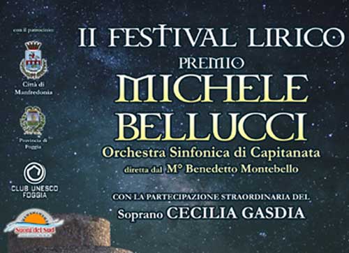 “PREMIO MICHELE BELLUCCI” = Dopo il grande successo di pubblico dell’edizione precedente, anche quest'anno l’Associazione culturale “La Corte del Re” di Manfredonia in collaborazione con l’Orchestra Sinfonica di Capitanata, il patrocinio di Comune di Manfredonia, Provincia di Foggia e Regione Puglia, ripropone il 2° Festival Lirico “Premio Michele Bellucci” (foto 1 sotto, focus locandina) per martedi 7 agosto alle 21 nello splendido scenario della Piazza d'armi del Castello di Manfredonia. Anche quest’anno confermata la presenza dell’Orchestra lirico-sinfonica di Capitanata e l’istituzione del Premio in onore di uno dei più illustri cittadini, compositore e storiografo, che la città di Manfredonia abbia mai avuto: Michele Bellucci.