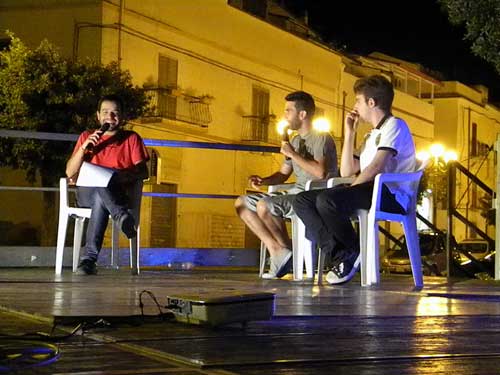 Il 26 luglio grandi emozioni artistiche e letterarie con l'apertura delle mostre 'Mayu' e 'Scenanera' di Gian Luca Palazzolo e l'intervista, con reading di alcuni brani del giornalista e artista Adriano Santoro, al giovane scrittore e poeta Teodoro Potenza (foto 1-2 sotto; ndr). Stasera, 28, dopo la serata dedicata al cinema emergente del 27, a Ischitella, spazio a un altro giovane giornalista, Michele Iula, che presenterà una sua inchiesta sulla malasanità, corpo del volume “Caduti in Corsia” (foto 3, focus cover), nel magnifico chiosco dell'ex convento francescano alle 21.