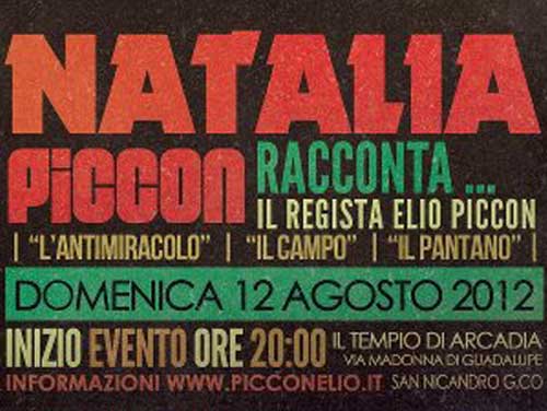 La sorpresa di trovare sul web “L’Antimiracolo” e tanti materiali inediti su Piccon mi ha spinto a contattare la figlia Natalia Piccon per un incontro nella Libreria-Caffè letterario “Il Tempio di Arcadia” di San Nicandro Garganico (località Due Pini, sul terrazzo-parcheggio di fronte al distributore Agip di via Marconi – foto 6-7, la locandina) il 12 agosto, alle 20 (anteprima a Peschici sabato 11 in Villa comunale alle 21; ndr). Un superstite fra gli attori non professionisti scelti da Piccon per girare “L’Antimiracolo” è Angelo Montemitro, nonno di Giovanni Barrella (titolare della Libreria e presidente del Gruppo Argod): il desiderio di mettere in contatto la figlia del regista con chi quei film interpretò sarà pertanto esaudito. Nelle due occasioni verranno proposti da Natalia anche stralci inediti della cinematografia del padre.