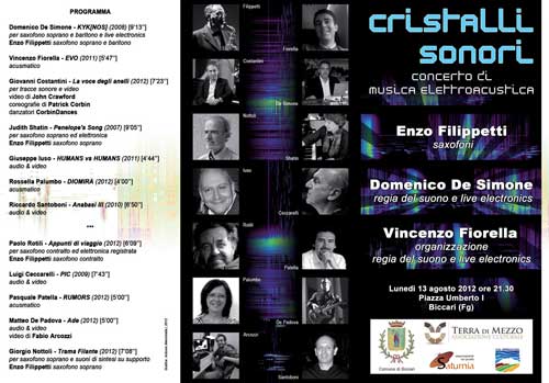 Clicca per Ingrandire Oggi 13 agosto, ore 21.30, in piazza Umberto I (vicinanze Chiesa Madre) a Biccari (Fg), “Cristalli Sonori”, Concerto di Musica Elettroacustica, porta in scena gli ultimi sviluppi italiani della musica elettroacustica. L’evento - promosso dal locale Comune in collaborazione con le Associazioni Culturali Terra di Mezzo e Saturnia, e GAL Meridaunia, - unico per tutto il territorio dei Monti Dauni, presenterà al pubblico il meglio del panorama elettroacustico italiano e della provincia di Foggia. A interpretare il repertorio ci sarà il saxofonista Enzo Filippetti, affiancato da Domenico De Simone e Vincenzo Fiorella (organizzatore) che cureranno la regia del suono e il live electronics. Saranno presentate al pubblico le varie tipologie di composizioni tipiche della musica elettroacustica: brani per saxofono ed elettronica su supporto, brani per saxofono e live electronics (elaborazione elettronica dal vivo), composizioni acusmatiche (senza esecutore) e brani con video.
