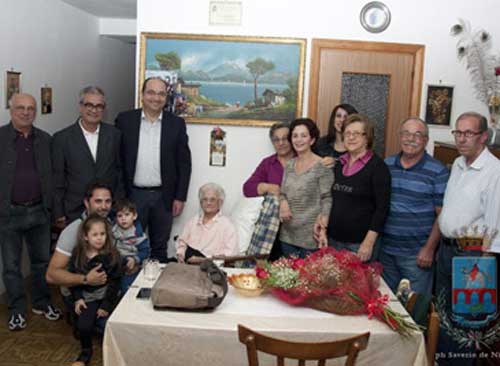 Circondata dalla presenza fisica e dall’affetto di alcuni dei suoi dieci figli viventi, su dodici dati alla luce (è stata un po’ meno prolifica di sua madre, arrivata fino a diciotto pargoletti), di nuore e cognati, nipoti e pronipoti (assente per influenza la pronipote da cui la separa un intero secolo di vita “e quattordici giorni”, aggiunge nonna Giuseppina), l’anziana donna ha saputo intrattenere senza fatica alcuna il sindaco avvolgendolo nei suoi racconti di vita. Senza fatica perché nonna Giuseppina è estremamente lucida, a dispetto dell’età, e ricorda perfettamente date ed eventi che hanno caratterizzato fin qui la sua esistenza.