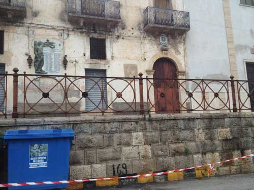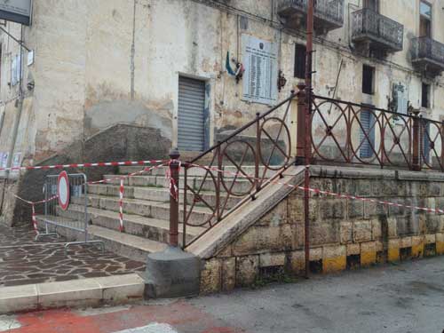 Clicca per Ingrandire Piogge copiose e totale non curanza della struttura: ingredienti perfetti per consumare una struttura già notevolmente usurata dalle infiltrazioni. Stiamo parlando dell’ex convento francescano (foto del titolo; ndr), ex sede del Municipio di Cagnano Varano, che dal 1995, cioè da quando il Comune è stato trasferito nella nuova sede, è in totale stato di incuria. Il 21 scorso, dopo le lunghe precipitazioni, è crollato il tetto in tegole che si è riversato sul solaio già semidistrutto qualche anno fa, quando sempre a causa delle infiltrazioni venne giù il soffitto affrescato dell’antica aula consiliare. Sono intervenuti sul posto i Vigili del Fuoco ed è stato chiuso l’intero sagrato di Piazza Giannone, compresa la Chiesa di Santa Maria delle Grazie (foto 1-2 sotto). A rischio anche i contigui locali della Parrocchia Santa Maria della Pietà.