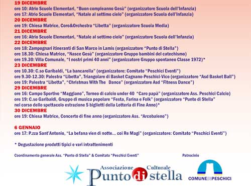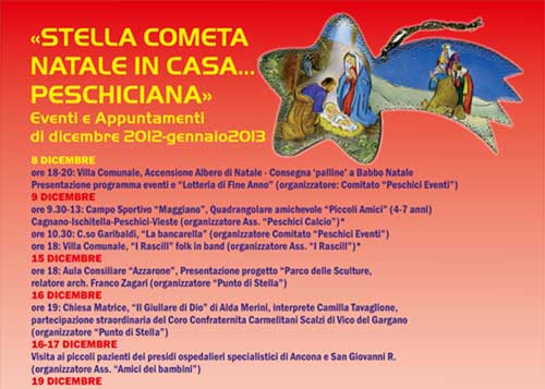 Clicca per Ingrandire Varato il programma “Stella Cometa – Natale in casa… peschiciana” che raccoglie eventi e appuntamenti dall’8 dicembre 2012 al 6 gennaio 2013 (foto del titolo e 1 sotto; il pdf completo in PERIODICI di Città Gargano). Non poche le difficoltà alle quali è andata incontro l’Associazione Culturale “Punto di Stella” - supportata logisticamente e fattivamente dalla sua ‘costola’ operativa, il Comitato “Peschici Eventi” - nel coordinare, a evitare di sovrapporle, le iniziative che fortunatamente fervono all’interno di altre associazioni locali e gruppi spontanei o legati a enti ecclesiastici, buon sintomo di un paese che “vive” anche d’inverno e non si perde nelle ‘nebbie del porto’ (che non c’è).