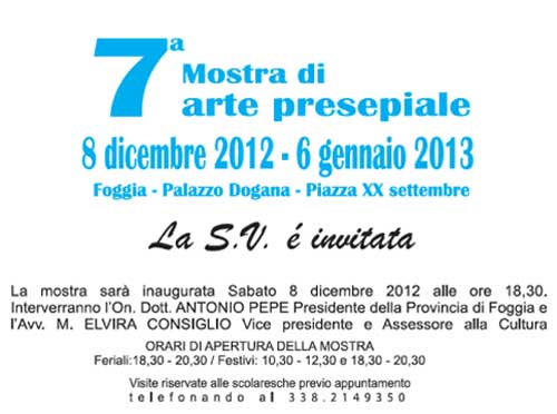 Clicca per Ingrandire Quest’anno l'Associazione Presepistica Foggiana organizza la 7ª Mostra di Arte Presepiale col Patrocinio dell’Amministrazione Provinciale di Foggia-Assessorato alla Cultura che ha concesso gli spazi della Sala Multimediale di Palazzo Dogana, sede dell’Ente (piazza XX Settembre. La Mostra è stata inaugurata sabato 8 dicembre alle 18.30 dal presidente della Provincia Antonio Pepe e dal suo vice e assessore alla Cultura Maria Elvira Consiglio. Resterà aperta fino al 6 gennaio 2013 coi seguenti orari di visita: giorni feriali - 18,30-20,30; giorni festivi - mattina 10,30-12,30 e pomeriggio 18,30-20,30.