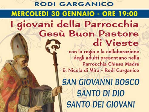 Il parroco, nella esortazione ad amare San Giovanni Bosco e in lui Gesù, ha invitato i giovani rodiani a essere coraggiosi testimoni del Vangelo e ha comunicato che il 30 gennaio sarà presente, in occasione del suo 16° anniversario di sacerdozio nella Chiesa Madre di San Nicola, il sacerdote che lo ha aiutato nel suo cammino vocazionale, don Tonino Baldi, parroco della chiesa Gesù Buon Pastore di Vieste, che celebrerà la Santa Messa delle 18. Dopo la Messa i giovani della parrocchia viestana, con la regia e la collaborazione degli adulti, presenteranno “San Giovanni Bosco, Santo di Dio, Santo dei giovani”, un musical (foto 2-3) di Piero Castellacci e Renato Biagioli. Il 31, festa di San Giovanni Bosco, sarà don Matteo Troiano, parroco di Santa Maria Maggiore di Ischitella, a parlare a ragazzi e giovani.
