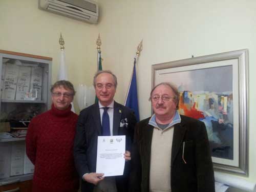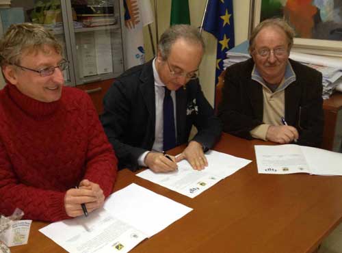 Clicca per Ingrandire Cerimonia ufficiale la mattina del 21 scorso nel Comune di Ischitella per la firma del Protocollo d’intesa relativo a salvaguardia e valorizzazione dei siti archeologici e del patrimonio storico-culturale dell’area Parco. A siglare il documento, che si propone di sviluppare forme di collaborazione fra le parti, il presidente del Parco Nazionale Stefano Pecorella, il sindaco di Ischitella Piero Colecchia e il presidente dell’Associazione culturale “G.P.R. Gruppo Ricerche Puglia” Giuseppe Compagni (foto del titolo, nell’ordine: al centro, a sx, a dx; ndr).