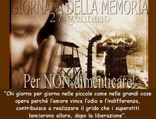 Legge 20 luglio 2000, n. 211: “La Repubblica italiana riconosce il giorno 27 gennaio - data dell'abbattimento dei cancelli di Auschwitz - ‘Giorno della Memoria’ al fine di ricordare la Shoah (sterminio del popolo ebraico), le leggi razziali, la persecuzione italiana dei cittadini ebrei, gli italiani che hanno subìto la deportazione, la prigionia, la morte, nonché coloro che, anche in campi e schieramenti diversi, si sono opposti al progetto di sterminio, e a rischio della propria vita hanno salvato altre vite e protetto i perseguitati.”