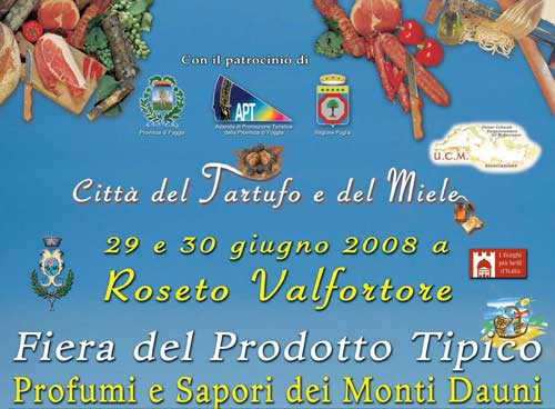 Clicca per Ingrandire  I profumi e i sapori dei Monti Dauni, ma anche le bellezze di mulini ad acqua e la natura incontaminata del Fortore, saranno i protagonisti indiscussi della “Fiera del Prodotto Tipico” di Roseto Valfortore. Domenica 29 e lunedì 30 giugno, nella città del tartufo e del miele saranno presenti aziende che producono zafferano, formaggi e salumi, pane, dolci e vari prodotti da forno, prodotti ortofrutticoli freschi e sottolio, olio, vino, legumi, liquori, marmellate, chicchere di produzioni dei monti dauni e ovviamente miele e tartufo nero “scorzone” di Roseto Valfortore.