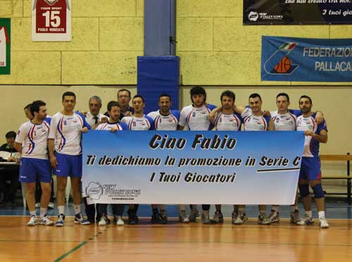 E’ un match senza storia quello che va in scena. Il Santa Croce, nessuna vittoria in tutta la stagione, è troppo debole e cede inesorabile senza riuscire nemmeno a difendersi in appena tre quarti d’ora (parziali 25-13, 25-6, 25-9), alzando bandiera bianca e consegnando di fatto la promozione alla squadra locale. Al fischio finale, il via ai festeggiamenti. Ma la mente va subito lì, all’indimenticabile Fabio. Tutti insieme gli uomini della New Volley corrono a omaggiare ancora una volta il loro mister con un grande striscione sul quale campeggia la scritta “Ciao Fabio. Ti dedichiamo la promozione in serie C” (foto del titolo; ndr).