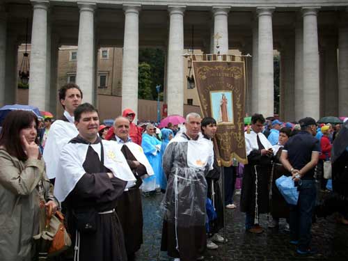 Vuoi mettere l'ordine teutonico delle Confraternite dei Paesi del nord Europa? Stavano in fila già dalle cinque del mattino, col foglietto rosa del pass in mano, in attesa del servizio d'ordine per transitare sotto il colonnato, ordinatamente. Noi arriviamo puntualmente in ritardo, i confratelli si cambiano d'abito mentre invadono il colonnato. Un agente del servizio d'ordine con una gracchiante radio in mano fa appena in tempo a leggere il gonfalone “Confraternita dei Carmelitani Scalzi-Vico del Gargano” e pronuncia frettolosamente: “Passasse”.