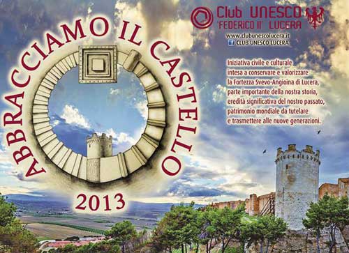 Clicca per Ingrandire Il Club Unesco “Federico II” di Lucera, impegnato per statuto in azioni volte alla salvaguardia e alla cura dei Beni Culturali, e da tempo interessato alla promozione dell’imponente Fortezza svevo-angioina, sabato 30 novembre ha deciso di affrontare una grande scommessa: una iniziativa culturale e civile dal titolo “Abbracciamo il Castello”, volta a sollecitare interventi efficaci per conservare, tutelare e valorizzare il Castello (come lo hanno da sempre chiamato i nostri padri), parte importante della storia lucerina, eredità significativa del passato, ricchezza culturale da trasmettere alle nuove generazioni.