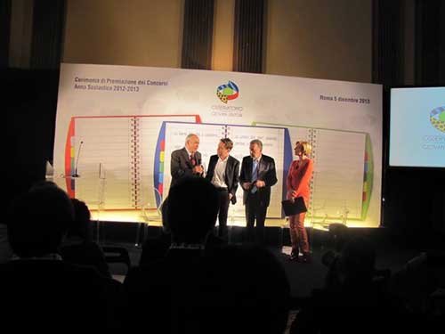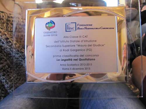La III Geometri CAT (oggi IV CAT-Costruzioni Ambiente e Territorio – foto 1 sotto, in classe) dell'Istituto superiore Statale “Mauro del Giudice” di Rodi Garganico ha vinto il primo Premio del concorso con un elaborato dal titolo: “Il Dialogo fonte di legalità” (foto 2, la targa). Una delegazione della classe, formata dalle studentesse Jessica Coccia e Aurora Troccolo e dalla docente Teresa Maria Rauzino, referente del Progetto (foto 3-4-5), ha partecipato alla Giornata Nazionale di Premiazione che si è svolta a Roma il 5 dicembre 2013 nella sede del quotidiano “Il Tempo” in piazza Colonna.