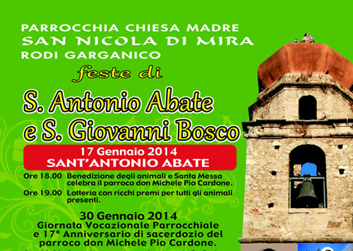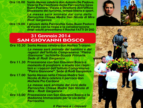Clicca per Ingrandire Grande movimento anche quest’anno in occasione della festa di San Giovanni Bosco a Rodi Garganico nella Chiesa Madre di San Nicola di Mira. Il parroco don Michele Pio Cardone (che il 30 gennaio festeggia il suo 17° Anniversario di sacerdozio; ndr), molto vicino ai giovani rodiani, nel presentare il programma della festa ha ricordato che il 2015 ricorrerà il Bicentenario della nascita di Don Bosco e per tale motivo la festa di quest’anno e dell’anno prossimo saranno piene di iniziative.