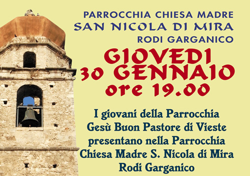 Ore 18 - Santa Messa: celebra don Antonio De Padova, vicario parrocchiale della Parrocchia Gesù Buon Pastore di Vieste. La messa sarà animata dal coro della Parrocchia Chiesa Madre San Nicola di Mira-Rodi Garganico