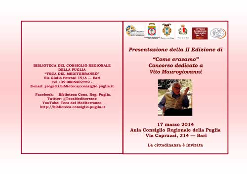 Clicca per Ingrandire Si terrà lunedì 17 marzo, alle 9, nell’Aula del Consiglio Regionale della Puglia (Via Capruzzi, 214 - Bari), la presentazione di “Come eravamo”, il concorso dedicato a Vito Maurogiovanni (scomparso il 4 marzo 2009 a 84 anni; ndr) giunto quest’anno alla seconda edizione Dopo una introduzione dell’opera di Vito Maurogiovanni a cura di Daniele Maria Pegorari - Università degli Studi “Aldo Moro” di Bari - seguiranno le letture a cura di Rino Bizzarro, Paola Martelli, Vito Signorile e Domenica Triggiani.