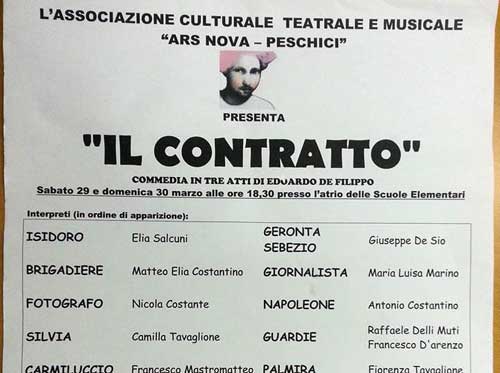 Clicca per Ingrandire Un meritato ed entusiastico successo di pubblico ha coronato ieri sera la rappresentazione - nell'atrio della scuola elementare di Peschici - della commedia di Eduardo De Filippo “Il contratto” (scritta e messa in scena per la prima volta il 1967) realizzata dalla Compagnia culturale, teatrale e musicale “Ars Nova” per la regia dell'attivissimo Stefano Biscotti. Articolata in tre atti, la commedia di De Filippo diffonde tra il pubblico gli ideali morali della bontà, dell'altruismo, della solidarietà e del prodigarsi dell'individuo allo scopo di garantire concrete opportunità di riscatto socio-economico ed emancipazione dalla povertà e dallo sfruttamento ai soggetti umani meno abbienti ed emarginati.