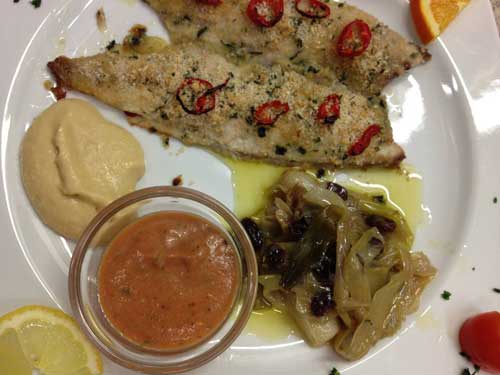 “La nostra Cucina tradizionale - continua Fiore - è unica in zona, i complimenti non mancano e tutti sono sorpresi per le nostre paste tipiche. Spesso i complimenti arrivano in cucina e mi dicono che mangiano meglio qui da noi che in Italia. Inoltre propagandiamo sempre la nostra Terra (nel locale non mancano mai depliant del Gargano e della Puglia) e ogni anno portiamo giù decine di amici-clienti”. Poi, dalle parole si passa ai fatti. Con una spesa di pochi euro, Fiore e Mattea propongono un piatto ricco di sapori e tradizione: i cipollotti (‘spunzalë’) preparati secondo tradizione sia a Peschici sia a Ischitella (diffusamente sul Gargano a farcire la pizza); il pane a crosta sui filetti; la crema di ceci (Fiore avrebbe preferito, per la ricetta a base di sgombro che sta per darci, le Fave di Carpino); il sorbetto di pomodoro piccante (foto 3). Ma… la ricetta? Eccola.