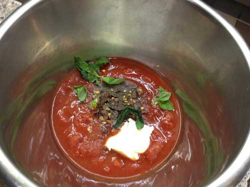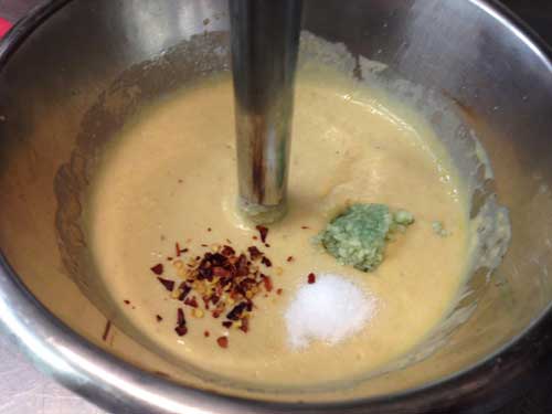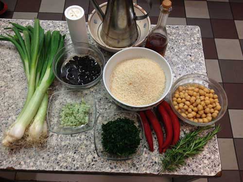 La crema di ceci si prepara aggiungendo ai ceci lessati peperoncino tritato, sale, aglio, passati in frullatore (foto 4). A parte si prepara il pangrattato, meglio se con molliche di pane raffermo, cui si aggiunge un trito di rosmarino, aglio e prezzemolo (servirà per la copertura dei filetti di sgombro - foto 5). La preparazione del sorbetto di pomodori richiede pomodori pelati, alcune foglie di basilico, due filetti di acciughe, aglio, pepe, peperoncino e un cucchiaio di panna acida, tutto in frullatore quindi per un’ora nel congelatore (foto 6). I cipollotti, puliti e sfogliati, vengono tagliati a metà e posti 5 minuti in padella per la cottura con olio extravergine d'oliva (foto 7), con aggiunta finale di uvetta precedentemente messa in ammollo per circa un’ora in vino bianco (o grappa).
