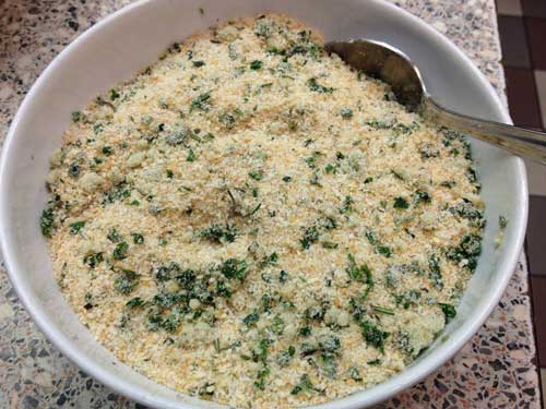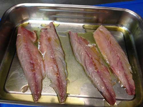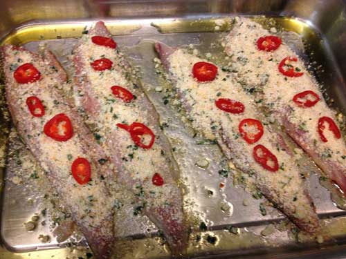 E passiamo all’ingrediente base: gli sgombri. Una volta sfilettati, si dispongono in una teglia ben oleata (foto 8). Si aggiunge il preparato di pangrattato e gli aromi, quindi fettine di peperoncino fresco e s’inforna per 15 minuti a 180° (foto 9). Al termine della cottura s’impiatta servendo, con ottima riuscita… e poca spesa, i filetti di sgombro in crosta di pane (foto 10). E buon appetito da Fiore e Mattea.