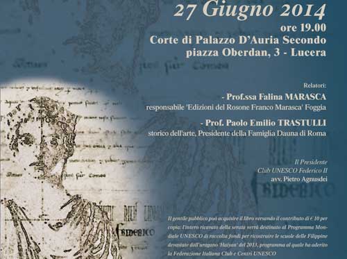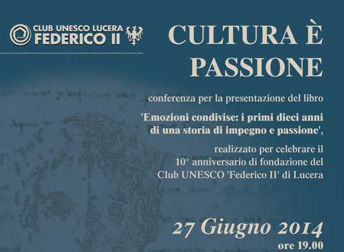 Clicca per Ingrandire Il Club Unesco 'Federico II' di Lucera ha organizzato per venerdì 27 giugno, alle 19 nella Corte di Palazzo D'Auria Secondo in Lucera (piazza Oberdan, 3), la presentazione del volume “Emozioni condivise” realizzato per celebrare il decimo anniversario della sua fondazione. Relatori della conferenza, dal titolo "Cultura è Passione", saranno Falina Marasca, responsabile 'Edizioni del Rosone Franco Marasca' Foggia e Paolo Emilio Trastulli, Socio Onorario del Club Unesco di Lucera, storico dell'arte e presidente della Famiglia Dauna di Roma.