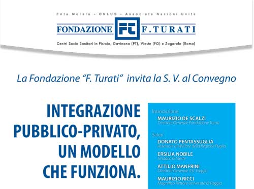 Clicca per Ingrandire “Integrazione pubblico-privato, un modello che funziona. Le ‘best practices’ in riabilitazione”, questo il titolo del convegno organizzato dalla Fondazione Turati con la collaborazione di medici ed esperti in programma per l’intera mattinata di sabato 6 dicembre, con inizio alle 9,30. Nella sala convegni della struttura socio-sanitaria di Vieste verranno esposti i principali aspetti legati al buon uso delle tecniche riabilitative e i risultati recentemente raggiunti, seppure in un contesto difficile di ‘spending review’.