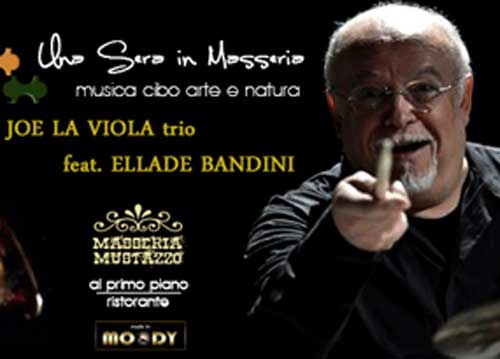 IL CONCERTO (ore 21,45 dopo la cena) = Sul palco della Masseria un super trio, originale e interessantissimo proporrà un repertorio composto da brani originali e standard - pop, funky e jazz - rimaneggiati con gusto e spirito innovativo e unico. Il Trio, capitanato dall'eclettico sassofonista Joe La Viola (foto 1 sotto), vede alla batteria la partecipazione di colui che è entrato unanimamente di diritto a far parte della grande storia della musica italiana: Ellade Bandini (foto 2).