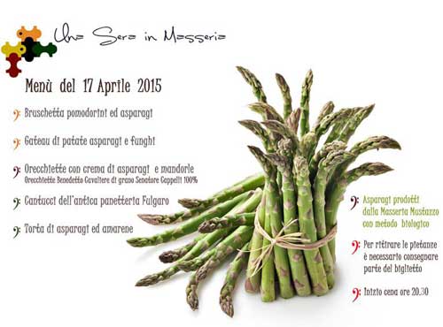 LA CENA (ore 20,30) = La cena si terrà prima del concerto, a seguire il dolce. Le portate saranno servite con stile informale, consentendo ai commensali di potersi muovere nella sala per chiacchierare. Il biglietto d’ingresso servirà per ritirare le diverse portate. Ogni suo riquadro corrisponderà a una pietanza. Protagonista gastronomico sarà l'asparago, prodotto con metodo biologico dalla Masseria Mustazzo e interpretato nell'intero menù (foto 3) dallo chef Nicola Russo. Il vino ospite sarà il Dolcetto d'Alba della Cascina Baricchi presentato direttamente dal patron Natalino Simonetta.