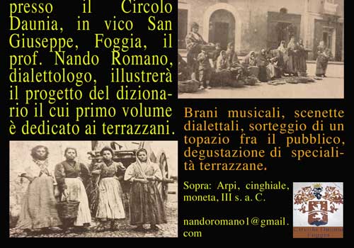 Un dizionario scientifico, insomma, del quale sul biglietto di invito è riprodotta una scheda che mostra la completezza del lavoro. Il primo volume è dedicato ai “Terrazzani”, dei quali vengono messi in luce condizioni di vita, ruolo delle donne, tecniche di raccolta e di caccia, piante, animali trattati… Un lavoro complesso e completo che per la prima volta riguarda questa importante categoria per la città di Foggia. Non per nulla il logo scelto è un cinghiale, magistralmente rappresentato in una moneta di Arpi del III secolo a. C. Anche i Terrazzani davano la caccia «’o púrkë salvaggë», come veniva inteso in dialetto, segno di continuità non tanto con Arpi, da cui Foggia non discende contrariamente all’opinione comune, ma nel vasto Tavoliere.