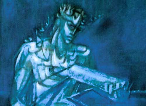 Clicca per Ingrandire “Il sogno di Manfredi progettista” (100x200 cm – foto del titolo, part.; ndr), olio su tela di Lidia Croce, è nato come monocromo bozzetto per un monumento portuale al personaggio storico di re Manfredi (1232-1266), fondatore della città di Manfredonia. Senonché, da intrigante progetto si è trasformato in un ritratto a figura intera (V. in PERIODICI di Città Gargano) che celebra la brevità dell’avventura umana del figlio naturale di Federico II di Svevia. La forma pittorica rende comunque giustizia alla descrizione che ne ha fatto Dante Alighieri, “Biondo era e bello e di gentile aspetto" (Purg., III, 107).