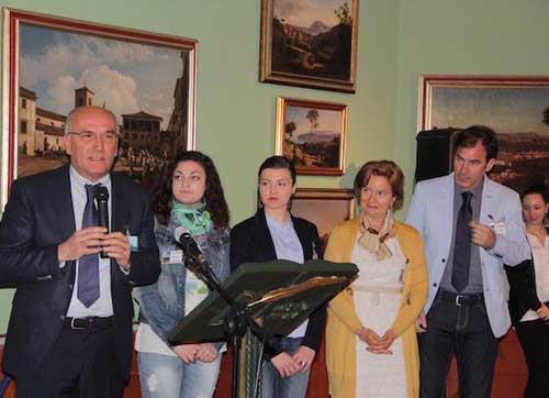 In foto (da sx) il dirigente scolastico Paolo Soldano, due alunne dell’Istituto, la prof.ssa Di Vieste e il prof. Prudente