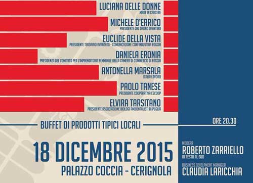 Ricco il parterre della tavola rotonda. Fa gli onori di casa Elena Gentile (Commissione lavoro-ambiente - vicepresidente intergruppo Economia Sociale). Ospiti: Omar Degoli (esperto in sharing economy), Paolo Tanese (presidente Cooperativa Escoop), Luciana Delle Donne (Made in carcere), Antonella Marsala (Italia Lavoro), Lucio Cavazzoni (presidente Coop. Alce Nero), Elvira Tarsitano (presidente Associazione Biologi Ambientalisti di Puglia), Daniela Eronia (Presidenza del Comitato per l’Imprenditoria Femminile della Camera di Commercio di Foggia), Vincenzo Bellini (presidente distretto della creatività Regione Puglia), Euclide Della Vista (presidente terziario avanzato - Comunicazione Confindustria Foggia), Michele D’Errico (presidente GAL Dauno Ofantino), Alberto Casoria (presidente GAL Meridaunia). Modera: Roberto Zarriello (Resto al Sud), tutoraggio a cura di Claudia Laricchia.