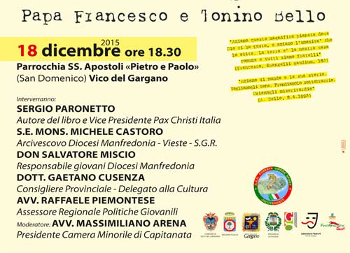 Inoltre: una giornata pro-Emergency di Gino Strada a cura della delegazione regionale pugliese con la presenza della presidente Cecilia Strada; la presentazione del libro “Padre Pio a Foggia” di padre Fortunato Grottola, coordinatore regionale dei Centri di Preghiera, e altri appuntamenti da svelare durante la conferenza stampa il 15 gennaio 2016 nella Sala Giunta della Provincia di Foggia. La rassegna si concluderà a fine luglio con l’assegnazione del premio finale durante la manifestazione FestAmbiente Sud a Monte Sant’Angelo. Come si nota, tanti gli appuntamenti da non perdere, a partire proprio da venerdì 18 dicembre, un’occasione decisamente importante, sia per promuovere la pace sia per far conoscere le figure di Papa Francesco e don Tonino Bello, veri soldati di Cristo.